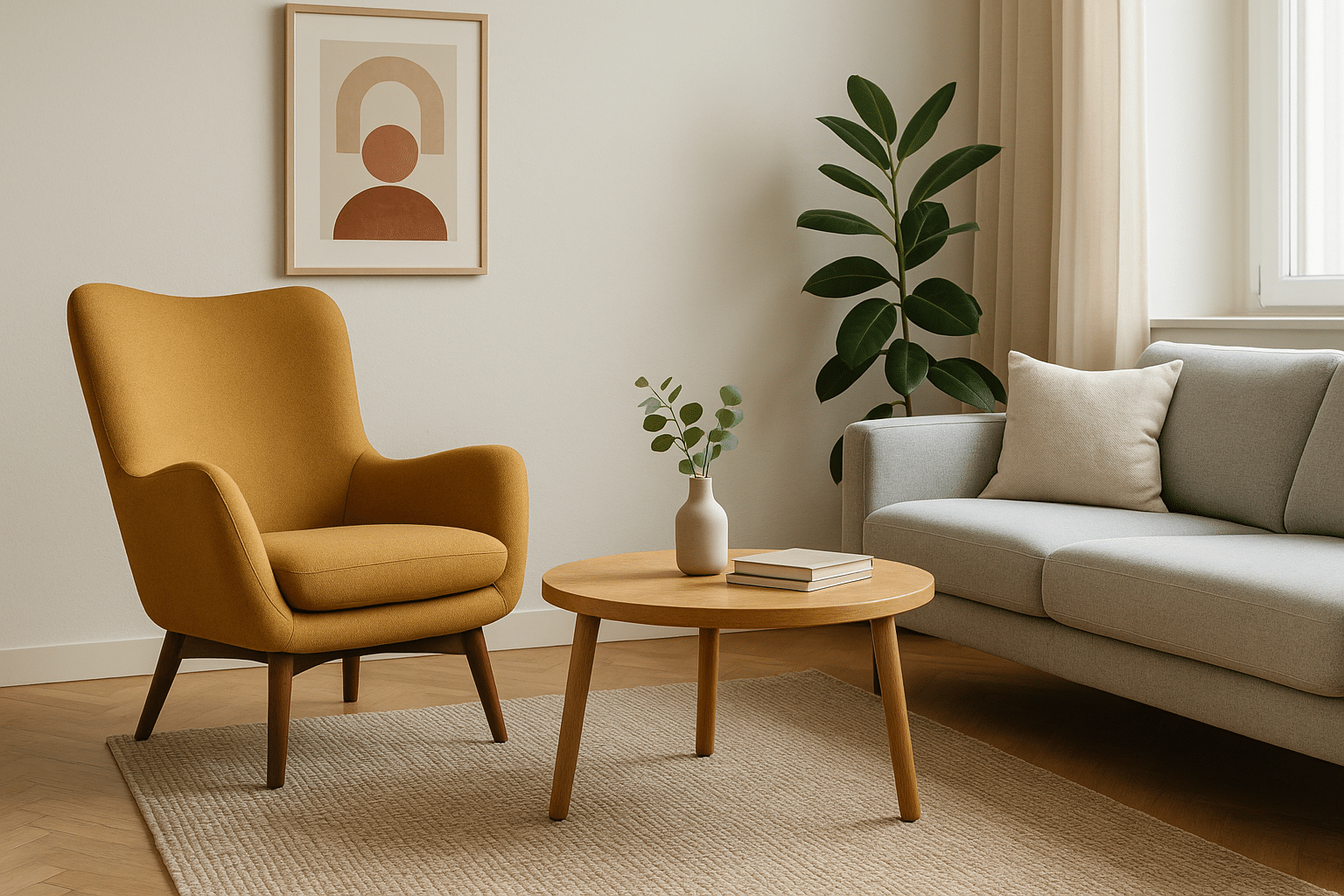 Se o sofá é imponente, opte por uma poltrona leve; se neutro, invista em cor ou design expressivo.