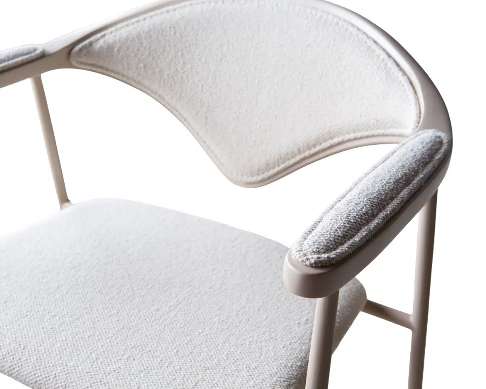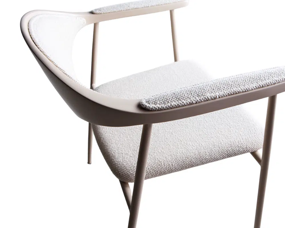 Estrutura em aço inox pintado e fibra de vidro com assento e encosto estofado em tecido náutico.