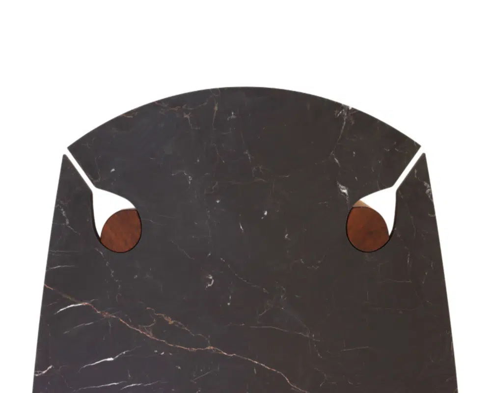 Os pés robustos são feitos de madeira maciça, disponíveis em Freijó ou Imbuia, que garantem estabilidade e durabilidade, além de exibir detalhes de marcenaria precisos. Os detalhes circulares de madeira onde os pés se conectam ao tampo, criam um contraste visual interessante, realçando o design da mesa.