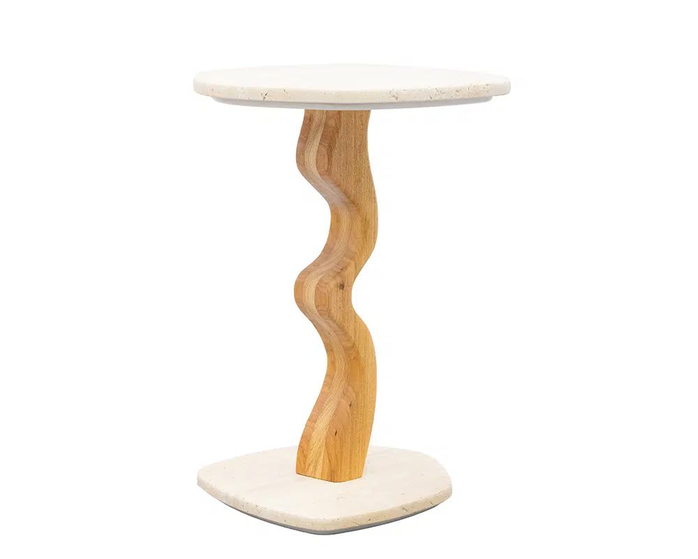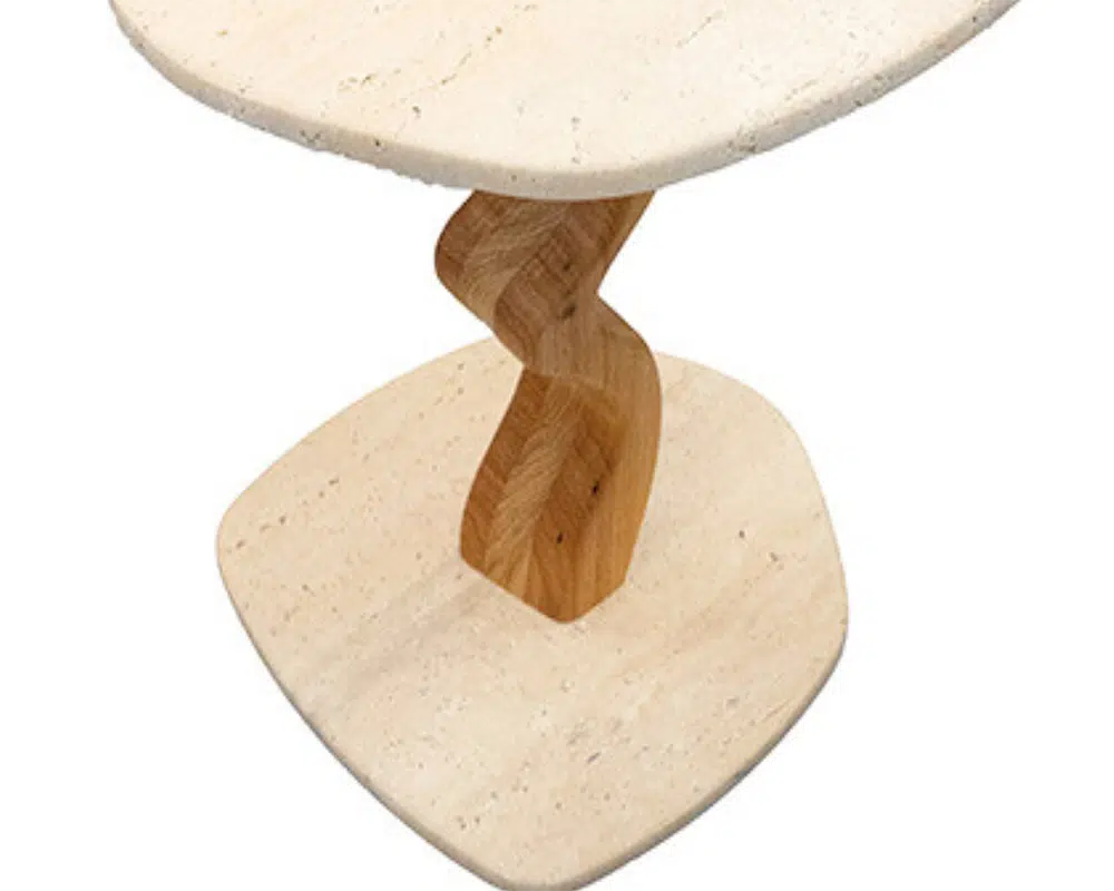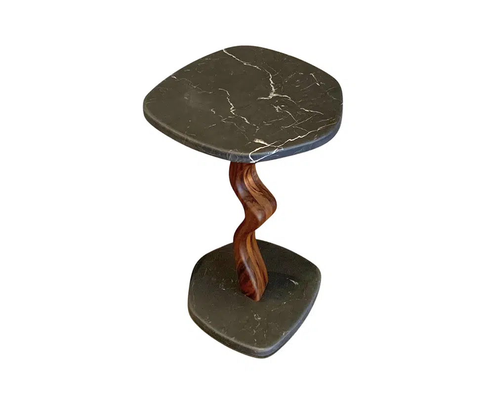 O tampo e base são feitos de mármore, conferem durabilidade e um visual clássico à mesa. O mármore é conhecido por sua beleza natural e resistência ao longo do tempo. Sua haste é construída em madeira maciça, disponível nas opções de Freijó ou Imbuía. Ambas as madeiras são apreciadas pela sua robustez e acabamento fino. A combinação do mármore com a madeira cria um contraste interessante, unindo a solidez da pedra com a textura orgânica da madeira.