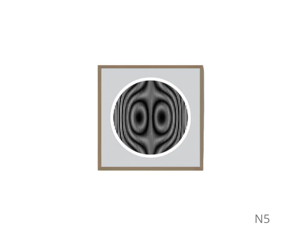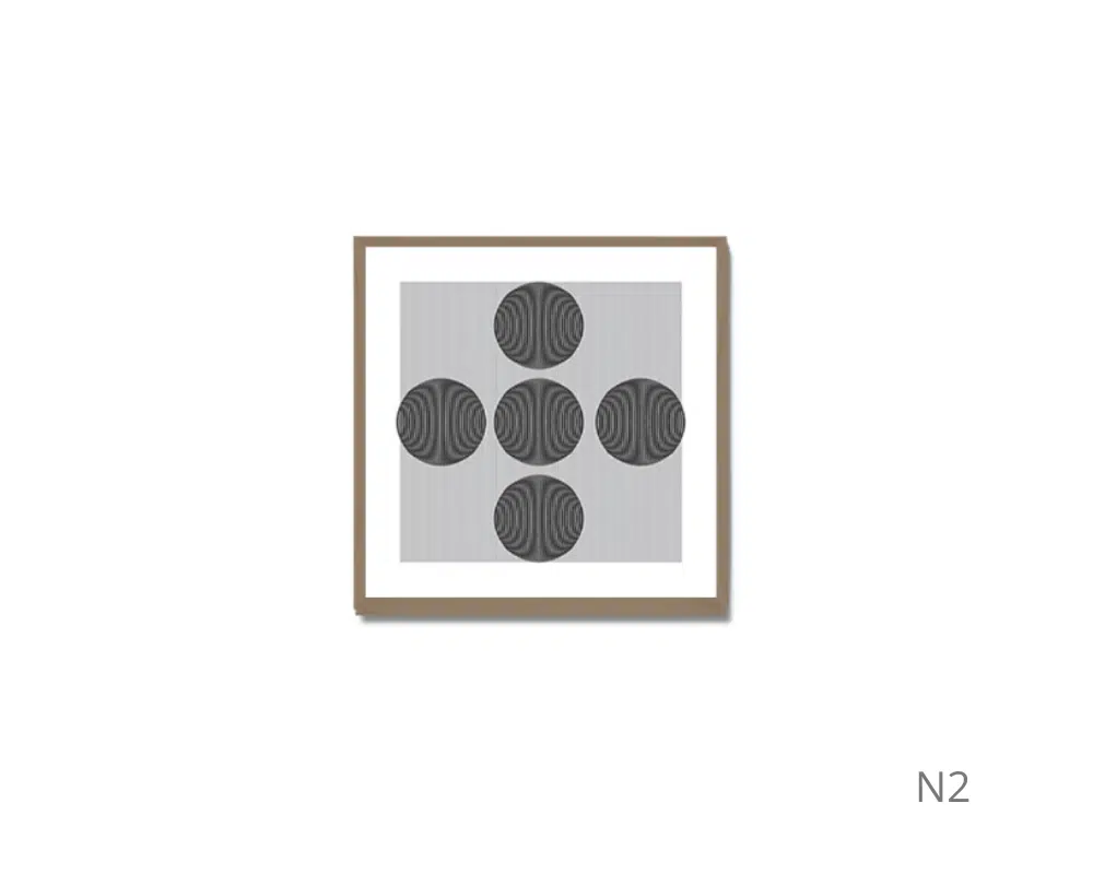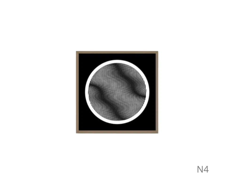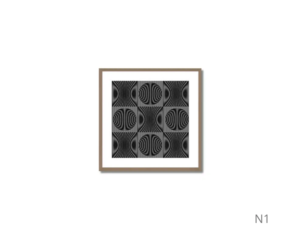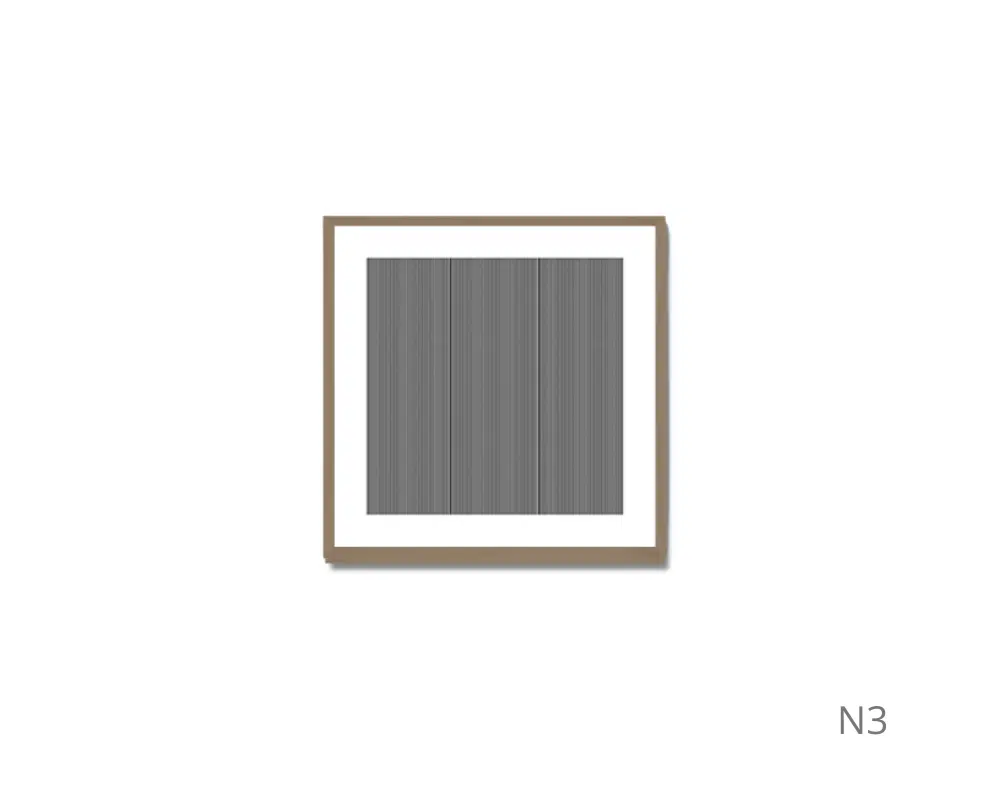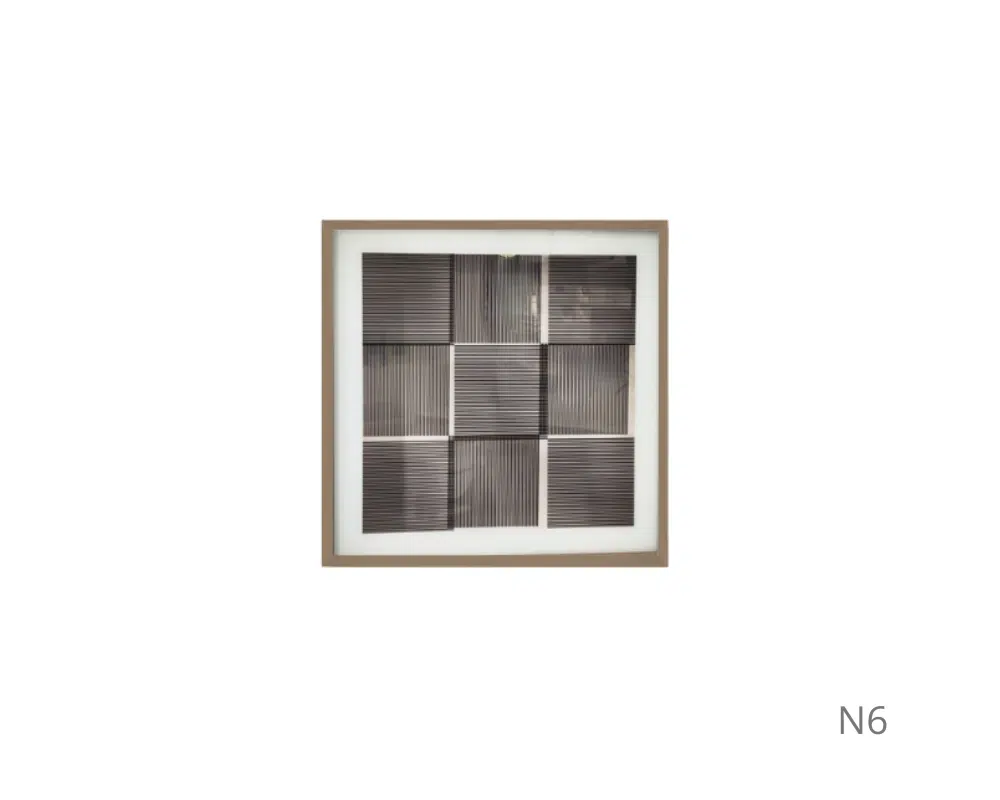 Cada painel possui padrões de linhas paralelas com orientações e espaçamentos variados, criando um design geométrico intrigante. A moldura clara e o fundo branco destacam a simplicidade e o minimalismo da obra, que estimula interpretações pessoais e efeitos visuais únicos.